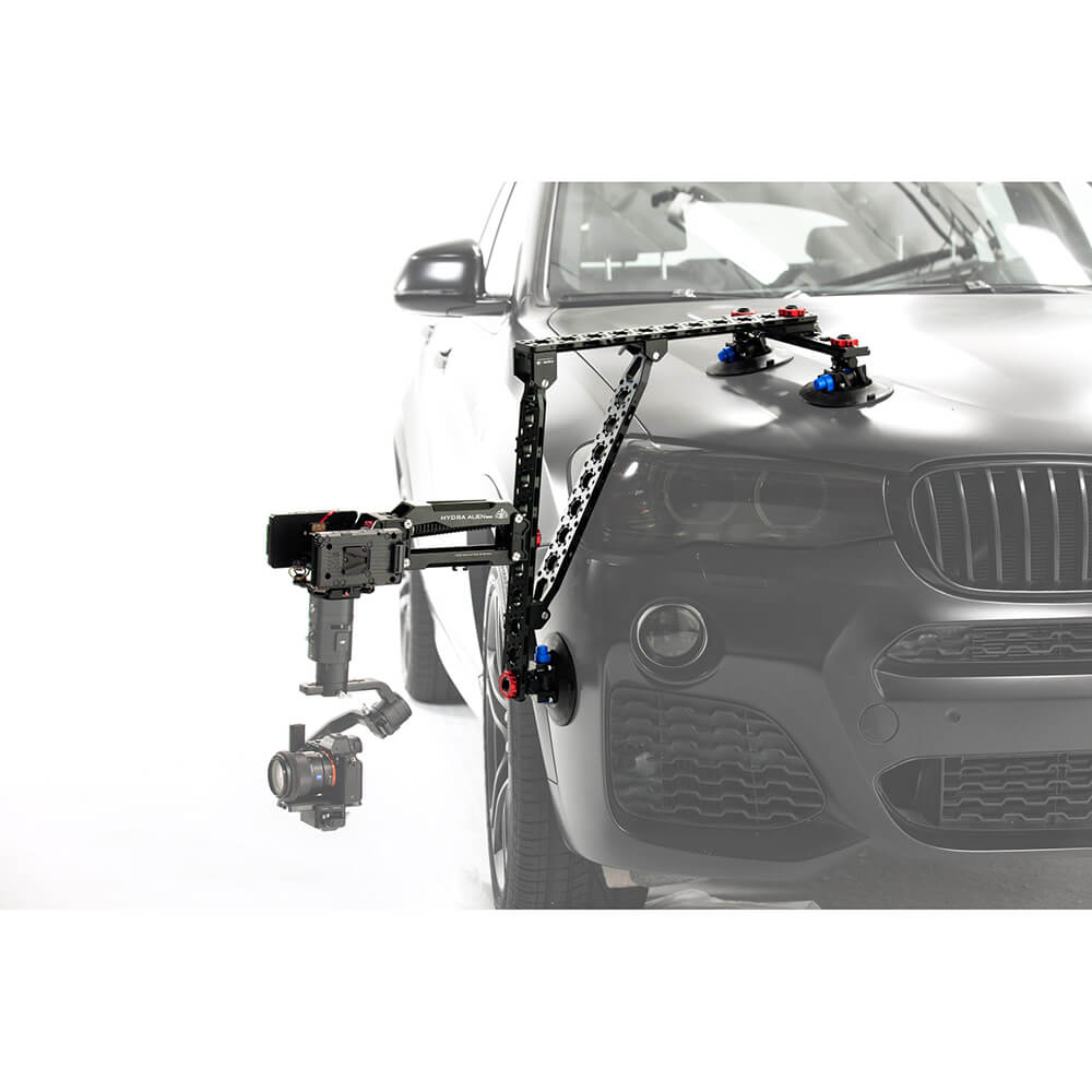 The Hydra Alien Car Mounting System was designed from the ground up to work in conjunction with smaller gimbals to allow for a lightweight solution to car-mounted cinematography. The system utilizes a highly customizable combination of suction cups and dovetail-like plates that when interconnected, allow the user to fine-tune the exact placement of their shot. The system also uses a shock absorbing arm to better stabilize the camera for certain shots as well as a spring-loaded cradle head if the intended shot requires that the gimbal be flipped upside down. High, low. To the side of the car, mounted on top of it - almost any car mounted shot can be configured using the Hydra Alien Car Mounting System. Let your imagination run wild!
